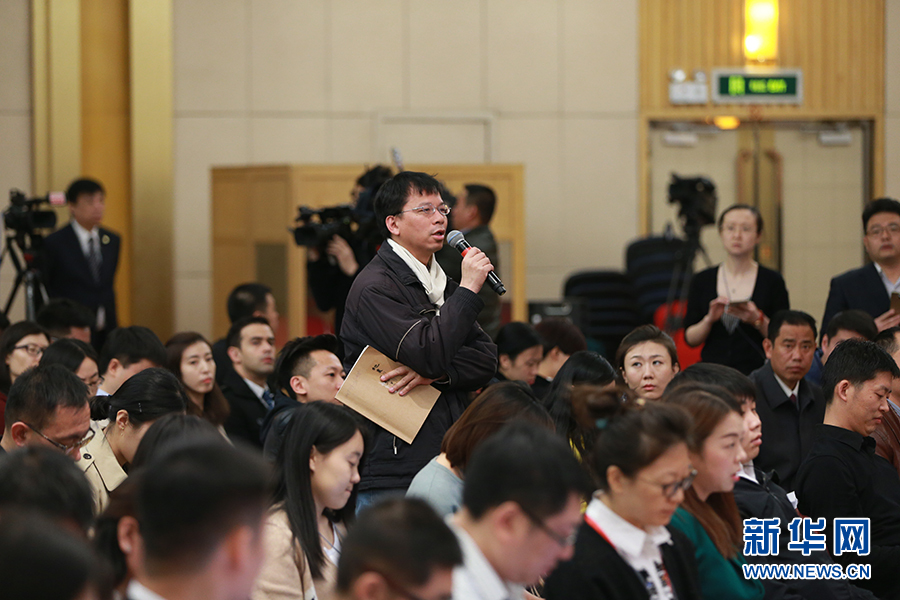 3月11日,十二屆全國人大五次會議新聞中心舉行記者會,邀請工業(yè)和信息化部部長苗圩、副部長辛國斌和總工程師、新聞發(fā)言人張峰就“推進(jìn)實(shí)施‘中國制造2025’”的相關(guān)問題回答中外記者的提問。圖為臺灣旺旺中時媒體集團(tuán)工商時報記者提問。新華網(wǎng)/中國政府網(wǎng) 傅義洲 攝