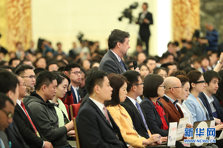 3月15日上午,國(guó)務(wù)院總理李克強(qiáng)在人民大會(huì)堂三樓金色大廳會(huì)見(jiàn)采訪十二屆全國(guó)人大五次會(huì)議的中外記者并回答記者提出的問(wèn)題。圖為美國(guó)有線電視新聞網(wǎng)記者提問(wèn)。新華網(wǎng)/中國(guó)政府網(wǎng) 翟子赫 攝?