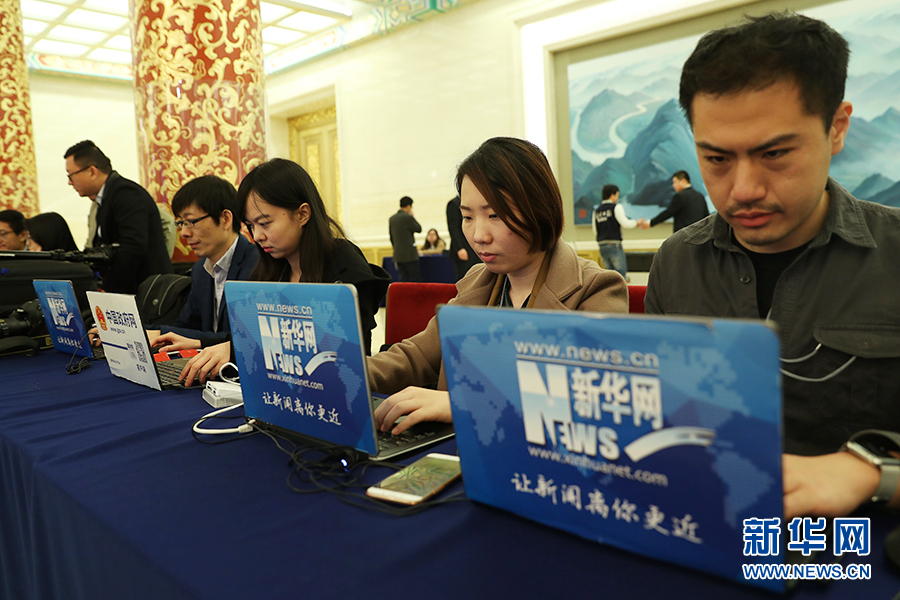 3月15日上午,國務(wù)院總理李克強(qiáng)在人民大會堂三樓金色大廳會見采訪十二屆全國人大五次會議的中外記者并回答記者提出的問題。圖為新華網(wǎng)記者在做直播準(zhǔn)備。新華網(wǎng)/中國政府網(wǎng) 翟子赫 攝