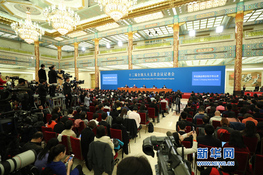3月15日上午,國(guó)務(wù)院總理李克強(qiáng)在人民大會(huì)堂三樓金色大廳會(huì)見(jiàn)采訪十二屆全國(guó)人大五次會(huì)議的中外記者并回答記者提出的問(wèn)題。圖為記者會(huì)現(xiàn)場(chǎng)。新華網(wǎng)/中國(guó)政府網(wǎng) 翟子赫 攝?