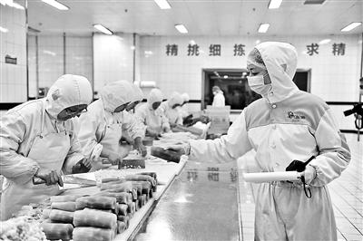 高鐵盒飯配菜車間。圖片來(lái)源:北京青年報(bào) 攝影/本報(bào)記者 袁藝