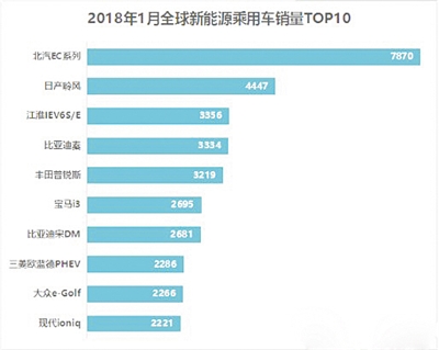 2018年1月全球新能源乘用車銷量超過(guò)8.2萬(wàn)臺(tái),其中中國(guó)新能源乘用車銷量達(dá)到了3.2萬(wàn)臺(tái),占比38.57%。從2018年1月全球新能源乘用車銷量排名來(lái)看,奪得冠軍的是自主品牌車型北汽EC系列,銷售了7870臺(tái);排在第二位的是日產(chǎn)聆風(fēng),銷售了4447臺(tái);緊隨其后的是江淮IEV6S/E,銷售了3356臺(tái)。除此之外,進(jìn)入TOP10的自主品牌車型還有比亞迪秦和比亞迪宋DM。(來(lái)源:電動(dòng)汽車資源網(wǎng))
