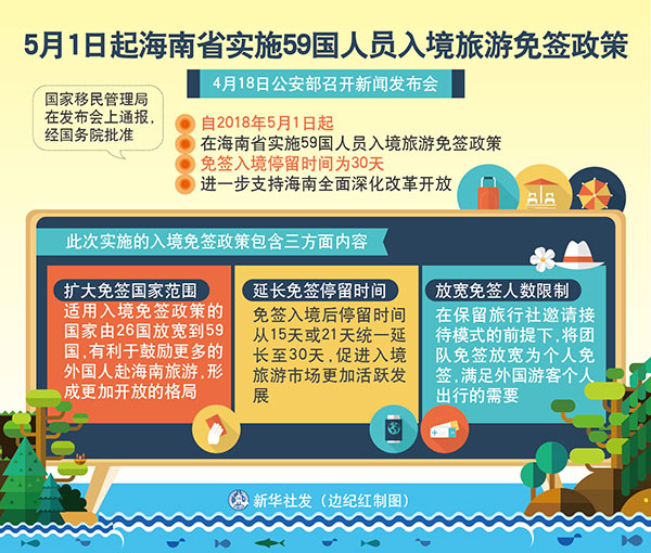 新華社北京4月18日電(記者 劉奕湛、丁小溪)公安部18日召開新聞發(fā)布會,國家移民管理局在發(fā)布會上通報,經(jīng)國務(wù)院批準(zhǔn),自2018年5月1日起,在海南省實(shí)施59國人員入境旅游免簽政策,免簽入境停留時間為30天,進(jìn)一步支持海南全面深化改革開放。