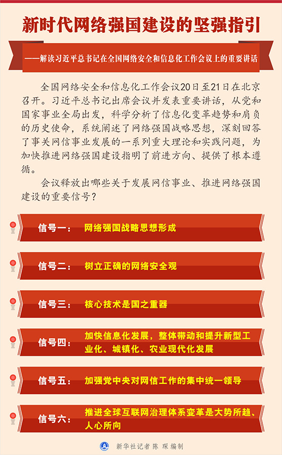 全國網(wǎng)絡安全和信息化工作會議20日至21日在北京召開。習近平總書記出席會議并發(fā)表重要講話,從黨和國家事業(yè)全局出發(fā),科學分析了信息化變革趨勢和肩負的歷史使命,系統(tǒng)闡述了網(wǎng)絡強國戰(zhàn)略思想,深刻回答了事關網(wǎng)信事業(yè)發(fā)展的一系列重大理論和實踐問題,為加快推進網(wǎng)絡強國建設指明了前進方向、提供了根本遵循。