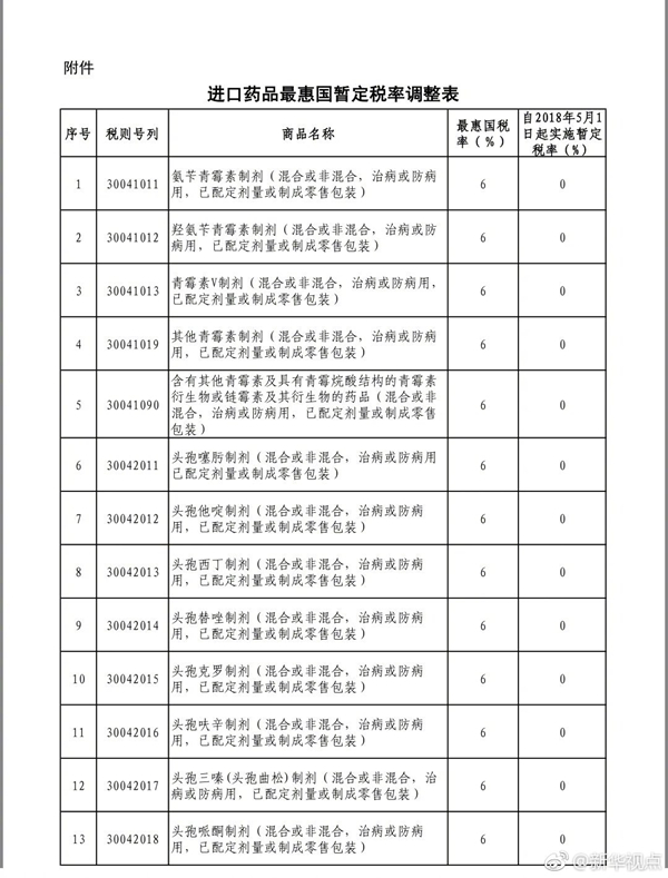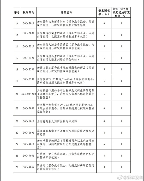 新華網(wǎng)北京4月23日電 財(cái)政部關(guān)稅司23日發(fā)布消息,5月1日起我國(guó)將取消包括抗癌藥在內(nèi)的28項(xiàng)藥品進(jìn)口關(guān)稅。調(diào)整后,除安宮牛黃丸等我國(guó)特產(chǎn)藥品、部分生物堿類藥品等少數(shù)品種外,絕大多數(shù)進(jìn)口藥品,特別是有實(shí)際進(jìn)口的抗癌藥均將實(shí)現(xiàn)零關(guān)稅。(記者郁瓊源) ????(據(jù)新華社“新華視點(diǎn)”微博報(bào)道)?