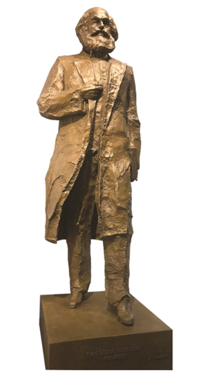 展廳入口處,一尊兩米多高的馬克思雕像,仿佛迎面向觀眾走來。這座由著名雕塑家、中國美術館館長吳為山創(chuàng)作的雕塑,栩栩如生地展現(xiàn)了馬克思的音容笑貌——目光深邃、從容淡定,傳遞著堅定前行的力量。