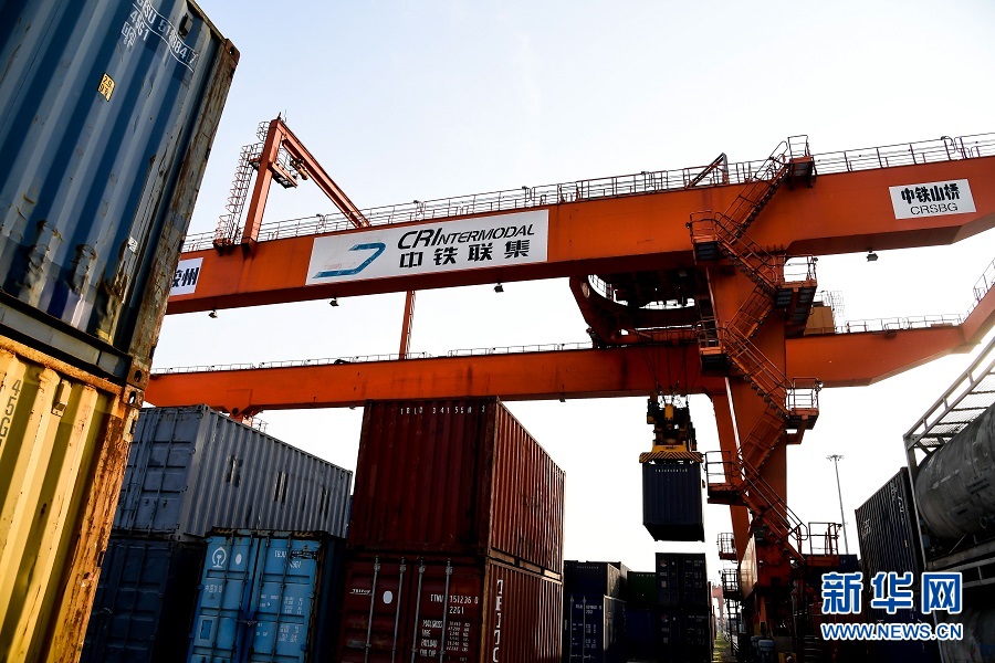 占地1800畝的中鐵聯(lián)集青島中心站內(nèi),藍(lán)色、白色的集裝箱把場站裝點成一片“集裝箱海洋”;橫穿場站的兩條鐵軌旁,數(shù)座巨型龍門吊繁忙作業(yè),來自海上的貨物被搬運(yùn)至將遠(yuǎn)行的國際班列上……