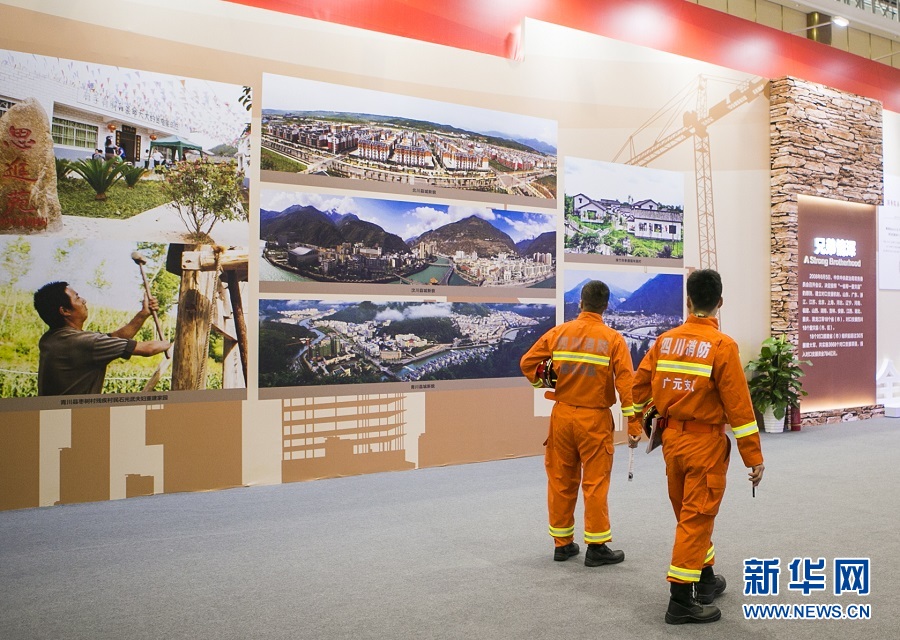 5月10日,兩名消防人員在成就展上參觀。當日,“5·12汶川特大地震災區(qū)發(fā)展振興成就展”在成都正式開展。該展覽用300余張照片、130余件套實物,全方位展示了汶川地震災區(qū)十年來發(fā)展振興所取得的歷史成就和城鄉(xiāng)面貌變化。新華社記者 張帆 攝