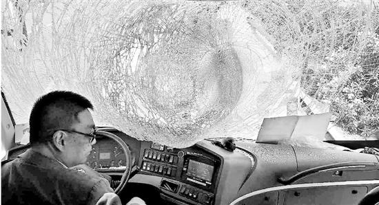 毫無(wú)征兆,一只輪胎突然飛來(lái)。只聽“砰”的一聲,大巴車的擋風(fēng)玻璃瞬間碎成蛛網(wǎng)狀,玻璃殘?jiān)w濺到駕駛員劉師傅和前排乘客身上。一兩秒鐘的時(shí)間,駕駛員的臉上、脖子受傷,全是血渣子。