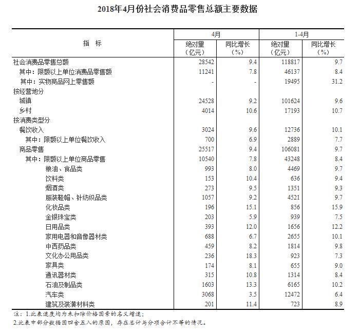 據(jù)國(guó)家統(tǒng)計(jì)局網(wǎng)站消息,2018年4月份,社會(huì)消費(fèi)品零售總額28542億元,同比名義增長(zhǎng)9.4%(扣除價(jià)格因素實(shí)際增長(zhǎng)7.9%,以下除特殊說明外均為名義增長(zhǎng))。其中,限額以上單位消費(fèi)品零售額11241億元,增長(zhǎng)7.8%。