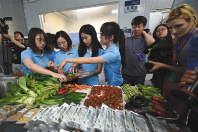 昨日,志愿者將實(shí)驗(yàn)艙內(nèi)的植物帶出艙外展示。