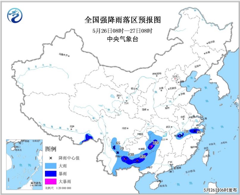 中央氣象臺預(yù)計,26日8時至27日8時,浙江中部、江西北部、湖南西部、貴州東部和南部、廣西中西部、云南東部和南部、四川南部等地的部分地區(qū)有大到暴雨,其中,湖南西南部、貴州東部、廣西西北部、云南東部局地有大暴雨(100~130毫米);上述部分地區(qū)并伴有短時強降水、雷暴大風(fēng)等強對流天氣,最大小時降水量40~60毫米。中央氣象臺5月26日6時繼續(xù)發(fā)布暴雨黃色預(yù)警。