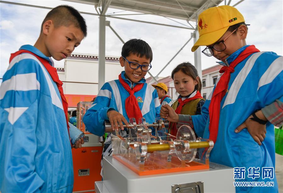 幾名學(xué)生在拉薩市流動科技館巡展活動現(xiàn)場體驗科學(xué)小實驗(5月24日攝)。 新華社記者 劉東君 攝