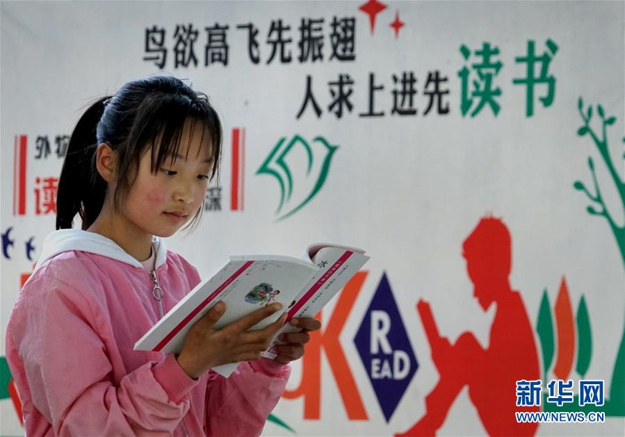 河南焦作市博愛縣寨豁鄉(xiāng)小學(xué)學(xué)生郭艷冰在校內(nèi)閱讀從“焦作市圖書館館外流通點”借閱的書籍(4月18日攝)。新華社記者 李安 攝