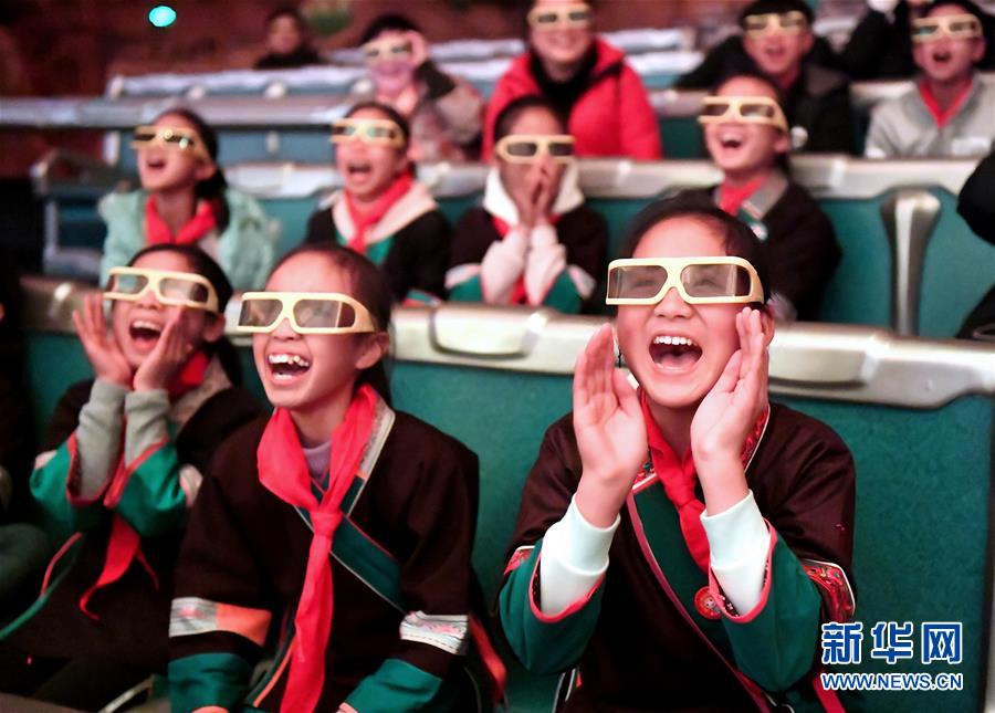 在廣西柳州市景行小學(xué)柳東校區(qū),來自三江侗族自治縣和融安縣大山里的留守兒童觀看3D動畫片(1月4日攝)。當日,柳州市舉行關(guān)愛留守兒童城市圓夢活動。新華社發(fā)(黎寒池 攝)