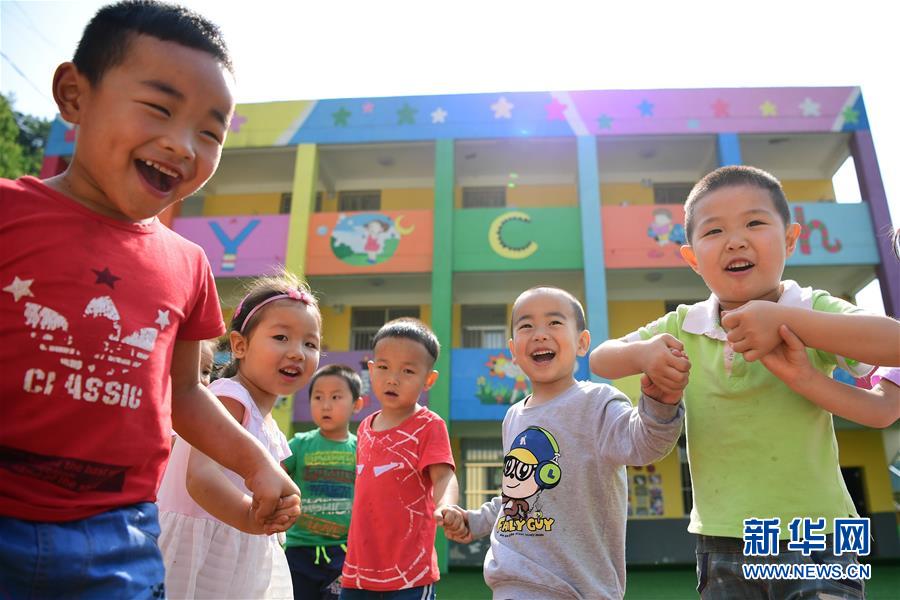 陜西省安康市漢濱區(qū)雙龍鎮(zhèn)杜壩村五四小學(xué)附設(shè)幼兒園小朋友們在操場上做游戲(2017年6月16日攝)。這個幼兒園使用貸款資金翻修改造而成,有效解決了該村及周邊兒童學(xué)前教育缺失的問題。新華社記者 邵瑞 攝