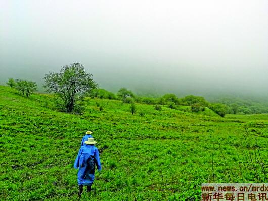 記者依依不舍地告別珙桐,又攀行一小時(shí)許,終于抵達(dá)海拔2200米左右的山頂“黃竹埡”。登高遠(yuǎn)眺,山的另一側(cè)呈現(xiàn)出截然不同的景象:一望無際的草叢鋪就連綿起伏的綠毯,散落的樹林在雨霧中勾勒出神秘而美麗的輪廓。