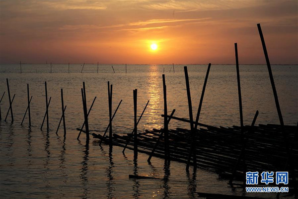 臺(tái)灣嘉義縣東石村連片的蚵架形成的“海田”被余暉浸染的景色(4月9日攝)。新華社記者林善傳攝
