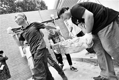 在昨天的文物搬運(yùn)現(xiàn)場,兩位工人挑擔(dān)子,兩位工人用手托住龍頭兩邊,四人費了好大勁才將螭頭搬到車上,開啟“回家”之路。待螭頭到達(dá)圓明園后,將有專家對它們進(jìn)行全身“體檢”,制定修復(fù)方案?!斑@些螭頭有一些小裂縫,如果不好好保護(hù),時間久了容易出問題?!眻A明園文物考古科科長陳輝說。(記者 李夢婷)