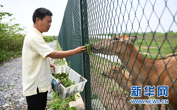 在洞庭湖麋鹿和鳥類救護(hù)避難所,宋玉成喂養(yǎng)被救助的麋鹿“點(diǎn)點(diǎn)”和它產(chǎn)下的小麋鹿(5月23日攝)。新華社記者 李尕 攝