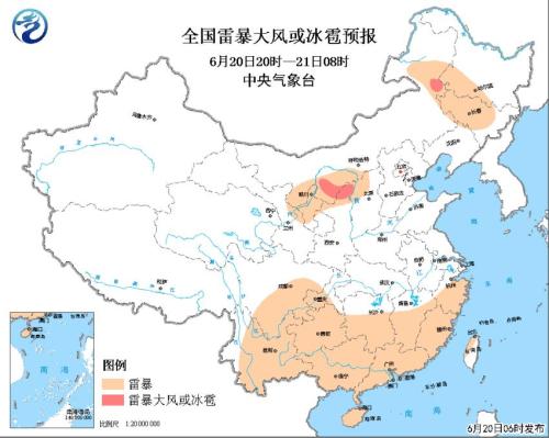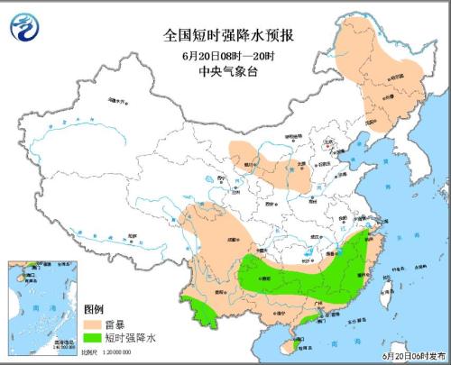 預(yù)計6月20日08時到21日08時,貴州、湖南中南部、江西、浙江、福建、廣東中北部、海南東北部、云南西南部等地的部分地區(qū)將有短時強降水天氣,小時雨強20-50毫米,局地可達60毫米以上;另外,內(nèi)蒙古中部和東部、吉林南部、遼寧東北部、浙江南部、福建北部和南部、廣東北部等地局地將有雷暴大風(fēng)或冰雹天氣。