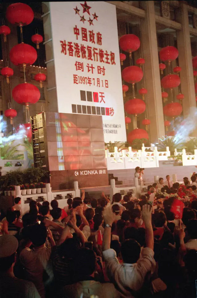 1997年7月1日零點,在天安門廣場參加北京市人民迎接香港回歸祖國聯(lián)歡會的人們觀看香港政權交接儀式的電視直播。中國政府對香港恢復行使主權倒計時牌標出:距1997年7月1日還有零天,零秒。新華社發(fā)
