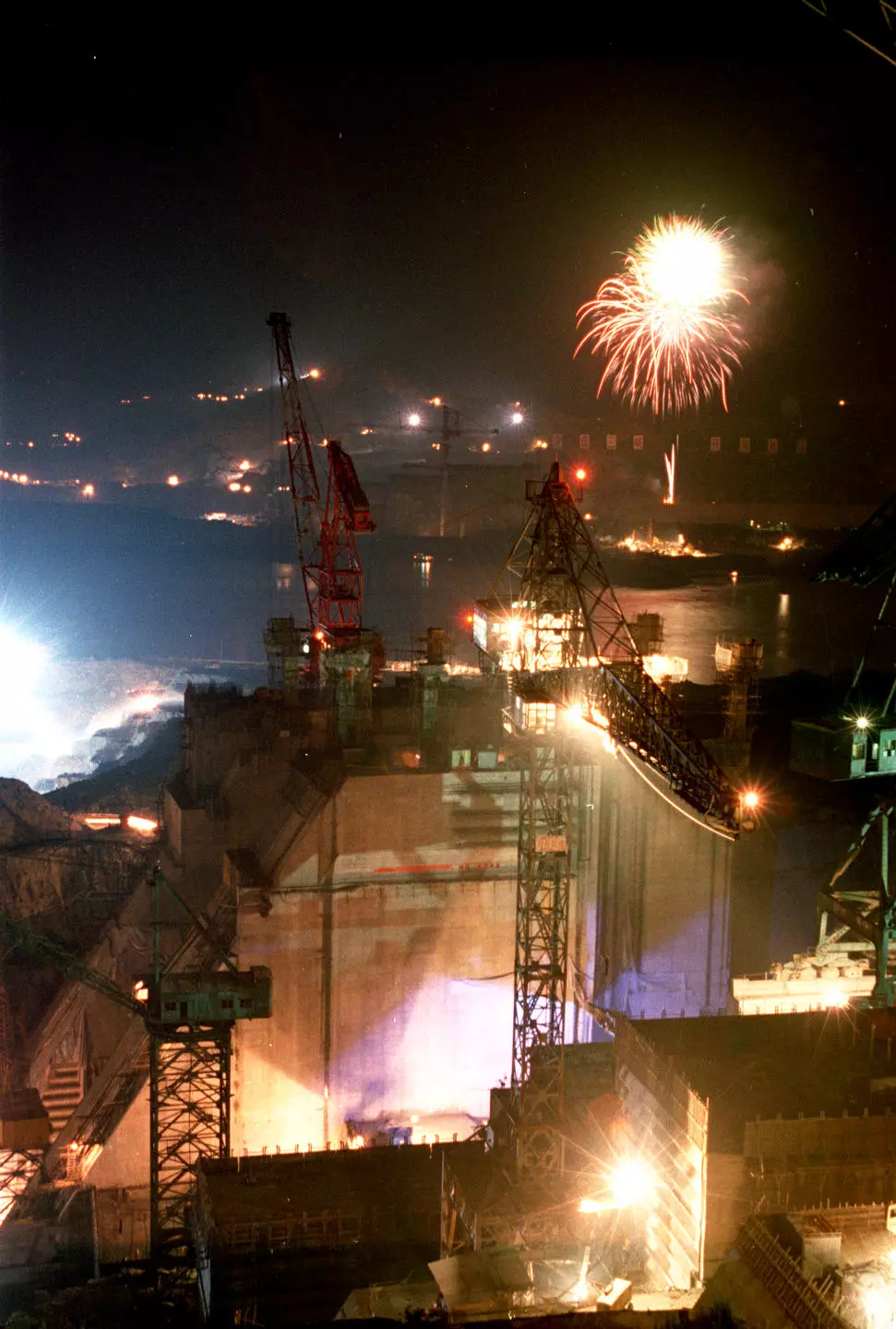 1997年6月30日晚,正在承建三峽工程導流明渠、臨時船閘、大江截流等施工項目的葛洲壩集團公司職工在工地上燃放焰火,慶祝香港回歸。新華社記者 杜華舉 攝