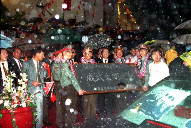 1997年7月1日清晨,中國人民解放軍駐香港部隊進入香港,受到香港市民的熱烈歡迎。新界區(qū)各界代表向駐香港部隊贈匾,贊解放軍為“威武文明之師”。新華社記者 王建民 攝