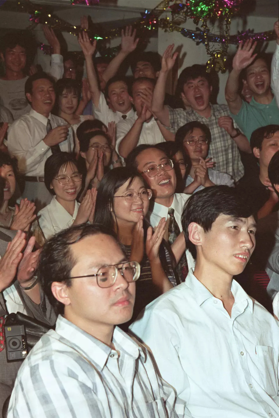 1997年6月30日,世界各地的華人華僑及中國留學生以各種方式慶祝香港回歸祖國。在日本日中友好會館后樂寮留學生宿舍舉行的聯(lián)歡晚會上,中國留學生在觀看香港政權交接儀式電視現(xiàn)場直播時,激動萬分。新華社記者 陳建力 攝
