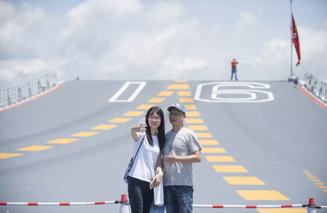 2017年7月9日,香港市民在遼寧艦的飛行甲板上留影。7月8日及9日,中國首艘航空母艦遼寧艦在香港向公眾開放。新華社記者 劉昀 攝