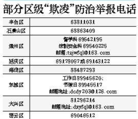 北京青年報記者注意到,東城、海淀、朝陽、豐臺、石景山、延慶等各區(qū)都建立了由多部門共同組成專門的防治中小學(xué)校欺凌領(lǐng)導(dǎo)小組,來統(tǒng)籌領(lǐng)導(dǎo)和指導(dǎo)本區(qū)學(xué)生欺凌防治工作,協(xié)助各中小學(xué)校穩(wěn)妥處置欺凌事件。在設(shè)立專門領(lǐng)導(dǎo)小組的同時,豐臺、石景山、通州、延慶以及海淀等區(qū)還公布了區(qū)級的中小學(xué)校園欺凌專屬的防治、舉報聯(lián)系電話。
