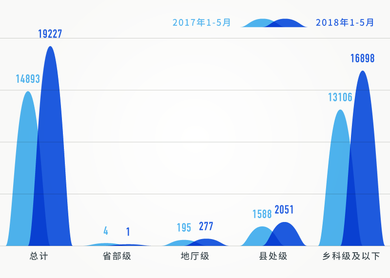 在給予黨政紀(jì)處分人數(shù)中,除省部級(jí)干部人數(shù)降低了以外,地廳級(jí)、縣處級(jí)、鄉(xiāng)科級(jí)及以下人數(shù)相比同期均大幅提升。特別是,今年1-5月,給予鄉(xiāng)科級(jí)及以下人員黨紀(jì)政務(wù)處分達(dá)16898人,相比同期增長28.9%,且占到了處分總?cè)藬?shù)的87.9%。反映出全面從嚴(yán)治黨不斷向基層延伸,持續(xù)加大查處群眾身邊的“四風(fēng)”和腐敗問題力度。