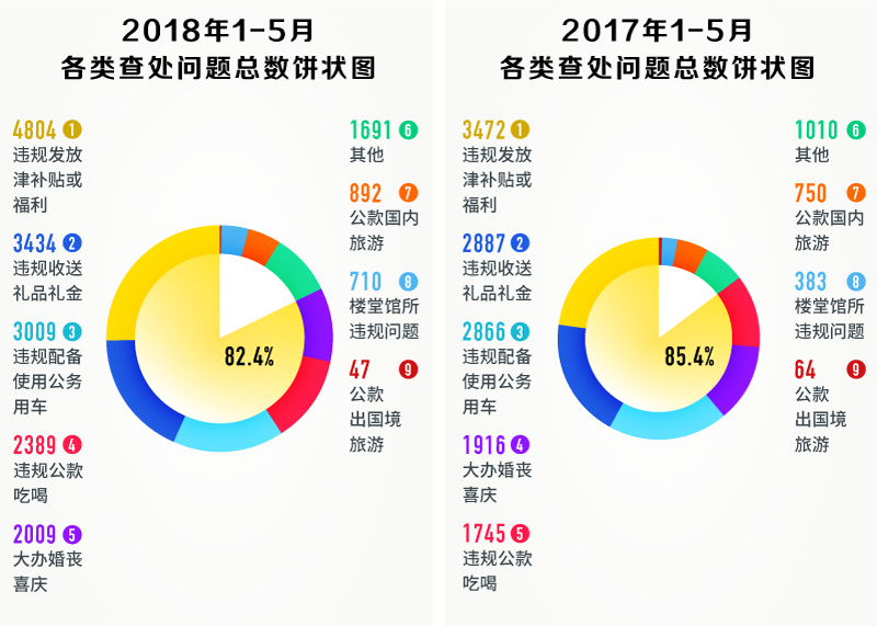 2017年、2018年1-5月各類查處問題總數(shù)餅狀圖,違規(guī)發(fā)放津補(bǔ)貼或福利、違規(guī)收送禮品禮金、違規(guī)配備使用公務(wù)用車、違規(guī)公款吃喝、大辦婚喪喜慶等“老問題”占比較大,均超80%
