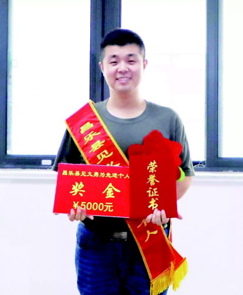近兩個(gè)月前,昌樂(lè)小伙劉洋明不顧個(gè)人安危徒手將一名墜樓的男童接住,劉洋明見(jiàn)義勇為的事跡得到廣泛贊譽(yù)和關(guān)注。7月4日下午,劉洋明被昌樂(lè)縣授予“見(jiàn)義勇為先進(jìn)個(gè)人”榮譽(yù)稱號(hào),并獎(jiǎng)勵(lì)5000元獎(jiǎng)金,然而,他轉(zhuǎn)身就將獎(jiǎng)金捐出。