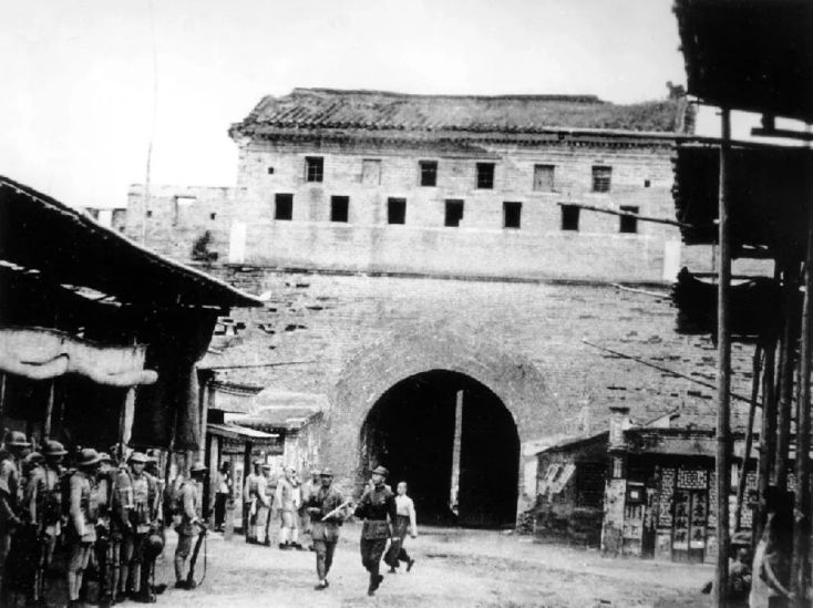 盧溝橋事變后的第二天,宛平城門口警戒的士兵和入城的民眾