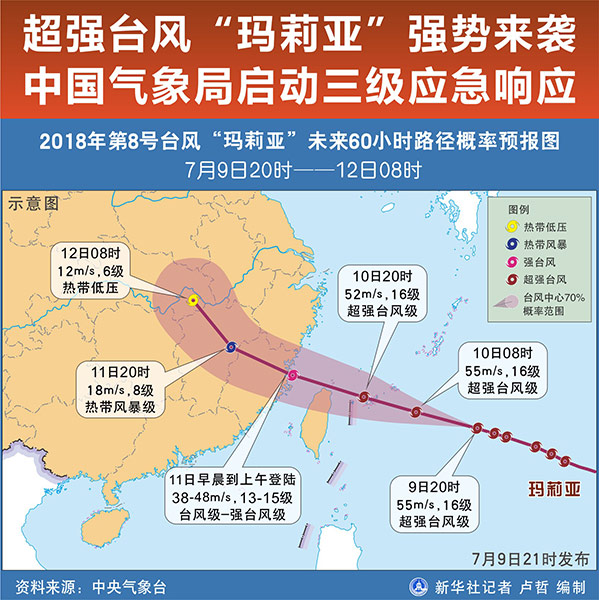 中央氣象臺預(yù)報,今年第8號超強臺風(fēng)“瑪莉亞”中心9日8時位于臺灣省宜蘭縣東偏南方約1260公里的西北太平洋洋面上。預(yù)計將以每小時30公里左右的速度向西偏北方向移動,逐漸向臺灣以東洋面靠近,將于10日夜間登陸或擦過臺灣東北部,并于11日早晨到上午在福建晉江到浙江溫州之間沿海再次登陸。登陸后繼續(xù)向西北方向移動,強度逐漸減弱。