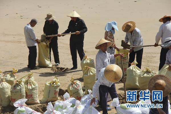 7月10日,在浙江省溫嶺市石塘鎮(zhèn)金沙灘,景區(qū)工作人員在進行加固堤壩作業(yè)。新華社發(fā)(金云國 攝)