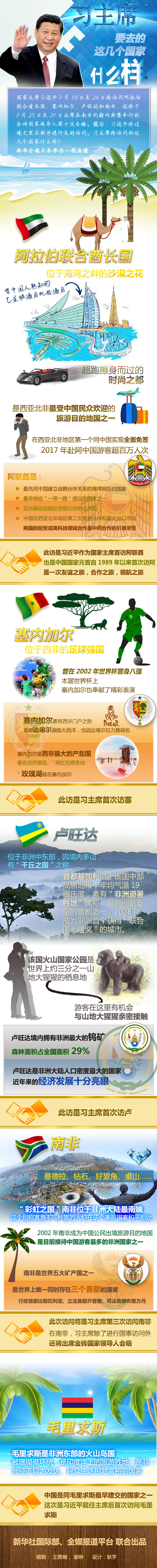 季夏之月,赴萬(wàn)里之約。7月19日至28日,習(xí)近平主席將對(duì)阿聯(lián)酋、塞內(nèi)加爾、盧旺達(dá)和南非進(jìn)行國(guó)事訪問(wèn),出席在南非約翰內(nèi)斯堡舉行的金磚國(guó)家領(lǐng)導(dǎo)人第十次會(huì)晤,過(guò)境毛里求斯并進(jìn)行友好訪問(wèn)。