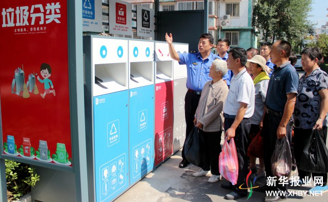 2018年7月13日,宿遷市宿豫區(qū)城管局的城管人員正在“垃圾分類站”現(xiàn)場引導(dǎo)居民分類、投放垃圾。孫東城 攝 視覺江蘇網(wǎng)供圖