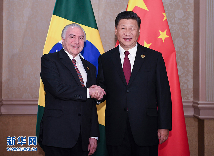 7月26日,國家主席習近平在南非約翰內斯堡會見巴西總統(tǒng)特梅爾。 新華社記者 王曄 攝