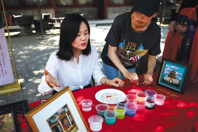 今年6月29日,西城區(qū)非物質(zhì)文化遺產(chǎn)保護(hù)中心,非遺傳承志愿者為市民介紹彩砂工藝。當(dāng)天,西城區(qū)啟動(dòng)非遺項(xiàng)目傳承志愿者招募活動(dòng)?;顒?dòng)共設(shè)5個(gè)項(xiàng)目,包括木板年畫(huà)、京作核雕等。資料圖片/新京報(bào)記者 王嘉寧 實(shí)習(xí)生 梁思成 攝