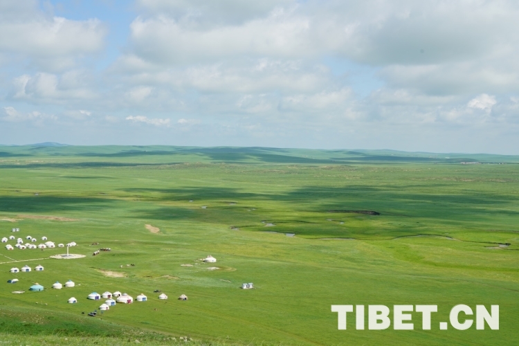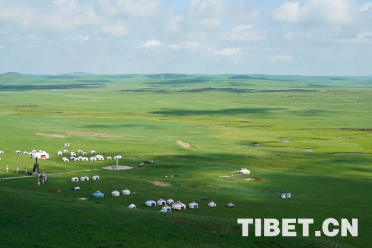 盛夏的草原上,仿佛是一片綠色的汪洋,朵朵金蓮花點(diǎn)綴其間,蜿蜒迂回的九曲彎靜靜流淌,白色的蒙古包掩映在巨大的云影之下,好一派盛夏光景。