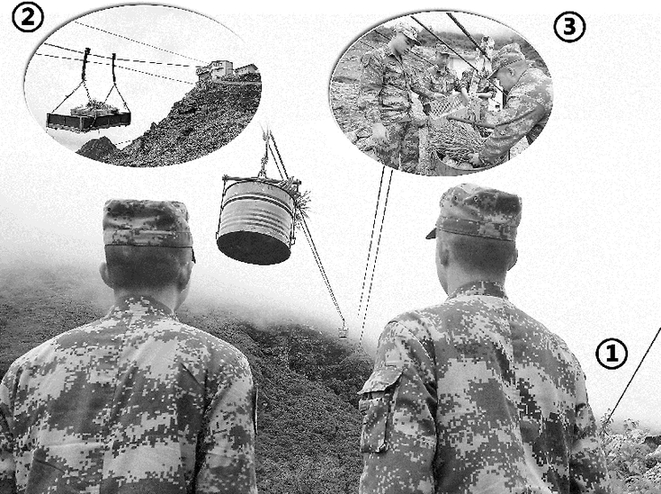 在索道運(yùn)輸平臺(tái)上,連隊(duì)官兵將副食、報(bào)紙書籍等物資,裝入幾個(gè)特制鐵箱中。在他們身旁,一根杯口粗的鋼索直入云霄……