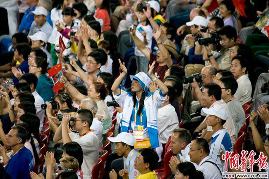 2008年8月21日,國家體育場“鳥巢”,志愿者帶領(lǐng)觀眾為運(yùn)動員鼓掌。中國青年報(bào)·中青在線記者 陳劍/攝