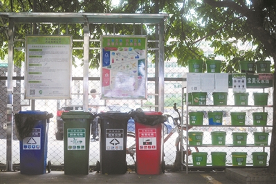 目前深圳已實(shí)施了小區(qū)垃圾分類1.0版和2.0版。深圳市城管局副巡視員楊雷介紹,1.0版是指分類設(shè)施已進(jìn)入小區(qū),同時(shí)在小區(qū)定期開展資源回收日等活動(dòng)。2.0版也就是“僑香村模式”,即是分類投放點(diǎn)在樓下集中設(shè)置,除此之外再無(wú)垃圾桶;每天垃圾投放的高峰時(shí)段,有志愿者在現(xiàn)場(chǎng)督導(dǎo)。