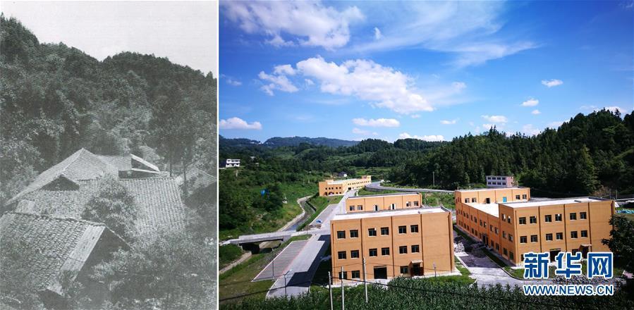 上游務(wù)川縣長江村。拼版照片:左圖為20世紀(jì)六七十年代的貴州省遵義市務(wù)川縣浞水鎮(zhèn)長江村;右圖為貴州省遵義市務(wù)川縣浞水鎮(zhèn)長江村新貌(務(wù)川縣委宣傳部提供)。新華社發(fā)(資料照片)