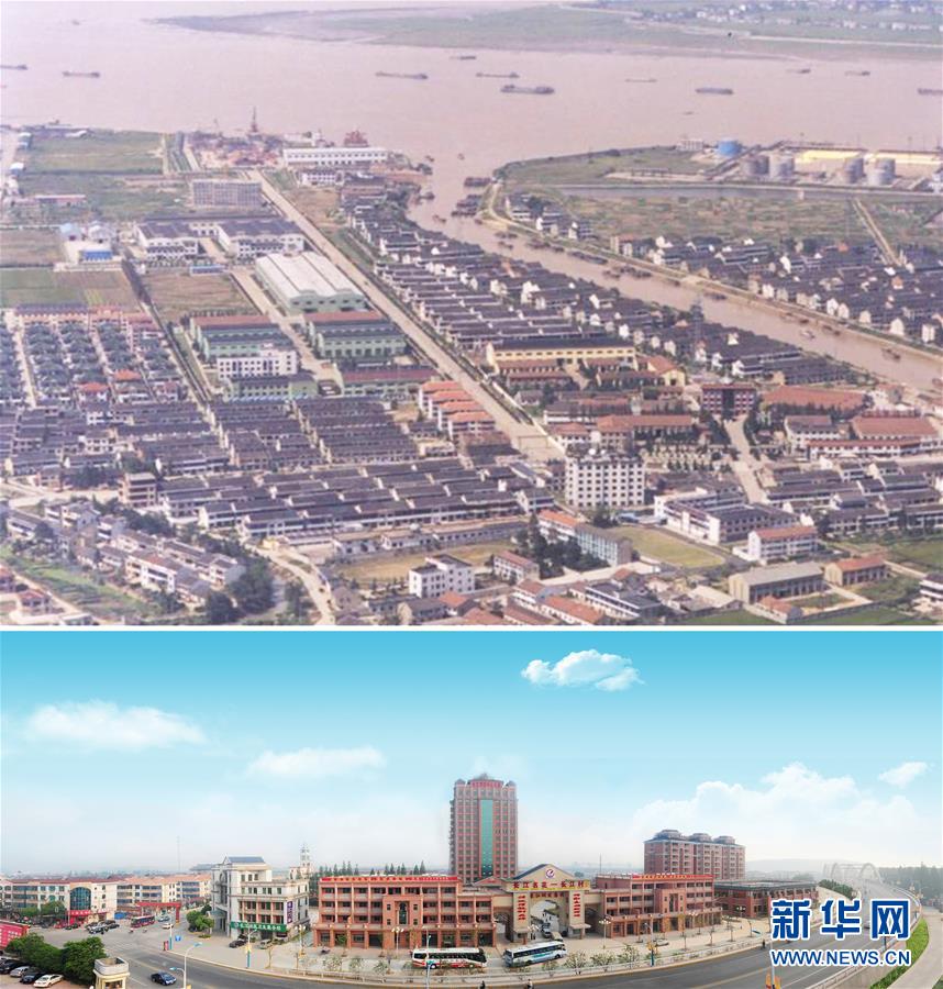 下游張家港市長江村。拼版照片:上圖為20世紀(jì)80年代拍攝的江蘇蘇州張家港市長江村;下圖為江蘇蘇州張家港市長江村新貌。新華社發(fā)(資料照片)