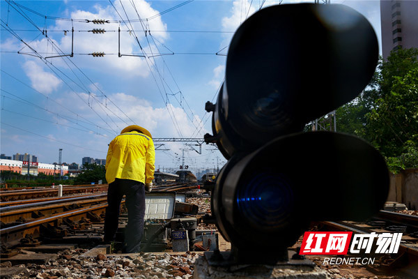 中國鐵路廣州局集團有限公司長沙電務(wù)段員工們不畏高溫,堅守在鐵路一線,作業(yè)人員正在對道岔設(shè)備進行調(diào)試。