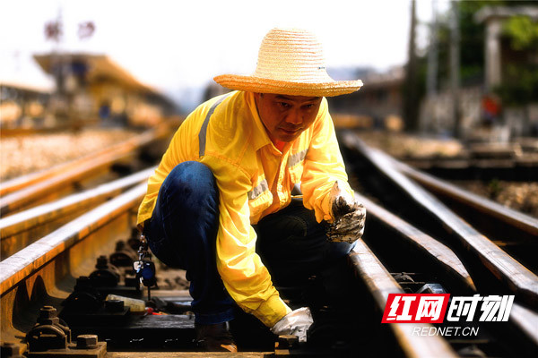 在相隔不到20米的作業(yè)地點,長沙信號工區(qū)工長胡正海帶領(lǐng)工友們對另一處道岔、軌道電路等設(shè)備進行巡視和設(shè)備注油作業(yè)。“人會因高溫天氣顯得更加疲憊,設(shè)備也會受到高溫天氣的影響,所以無論太陽多么炙熱,設(shè)備巡視必不可少?!焙R贿叢梁挂贿吔榻B。
