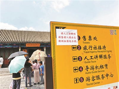 14日下午,北青報記者來到了恭王府博物館。正值暑期,景區(qū)大門外的廣場上聚集了眾多游客,其中有些是旅行團(tuán)整團(tuán)參觀,還有一些是散客。